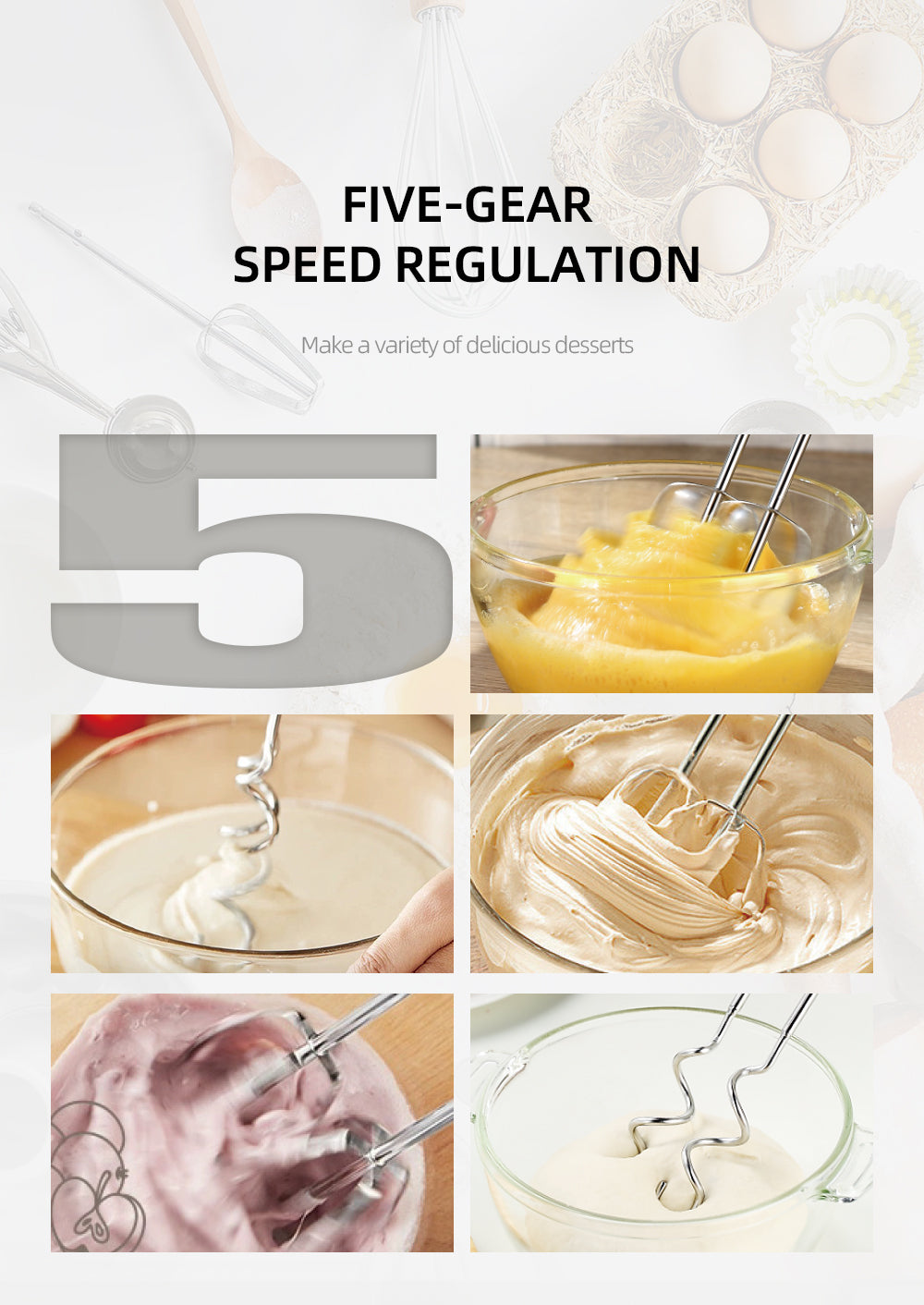 – Crearea rapidă a cremelor, aluaturilor, frișcă, piureuri, spume și multe alte preparate delicioase.