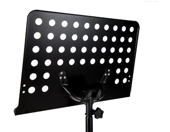 Stativ pentru orcheste muzicale cu suprafata perforata, realizat din metal durabil ce este prevazut cu o baza tripod rezistenta. Stativul de partituri ofera posibilitatea de reglare pentru situatiile in care performantele muzicale sunt redate in pozitie verticala sau sezut cat si reglaj pe inaltime.